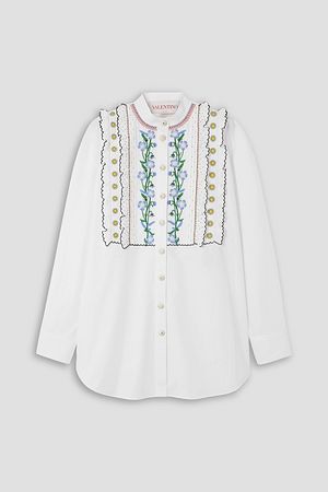 The brushstrokes might be yours: some chandelier earrings, a hot hue of lipstick or perhaps a brooch. (The latter approach was chosen by one of the earliest female white-shirt adopters, Katharine Hepburn in the 1938 film Holiday. Prior to that, no nice girls wore white blouses. Shirts were strictly for the boys.) Then again, the flourishes might be the shirt’s own: a ruffle, a flounce, a bow, embroidery, a bouffant shoulder or cuff; all of the above.