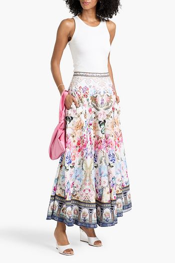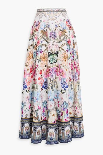 Embellished printed linen maxi skirt