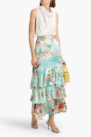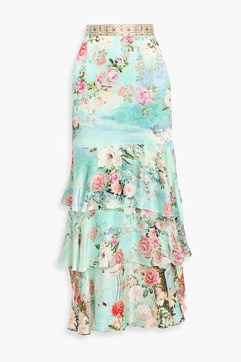 Ruffled printed linen and silk-blend maxi skirt
