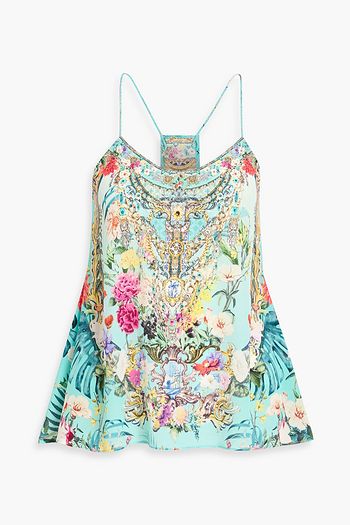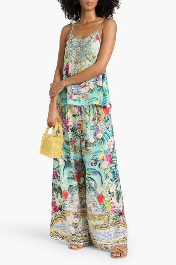 Crystal-embellished floral-print linen and silk-blend bra top