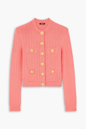Button-embellished ribbed pointelle-knit cardigan
