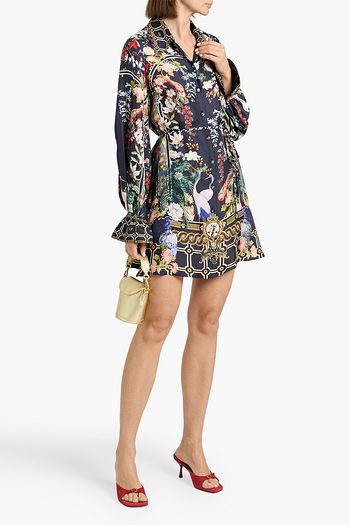 Feather-trimmed printed silk crepe de chine mini shirt dress