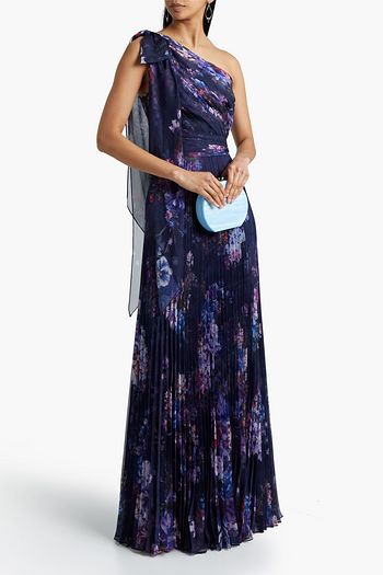 One-shoulder pleated floral-print chiffon gown