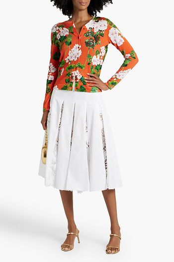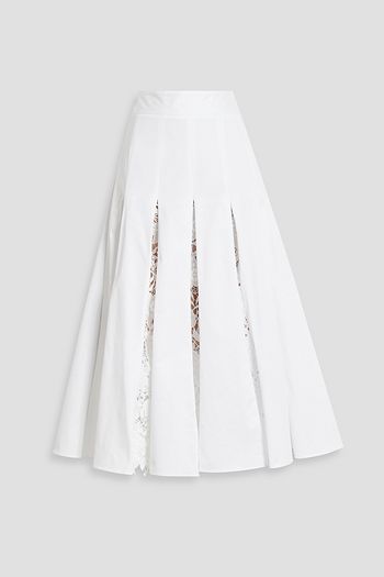 Pleated guipure lace and cotton-blend poplin midi skirt