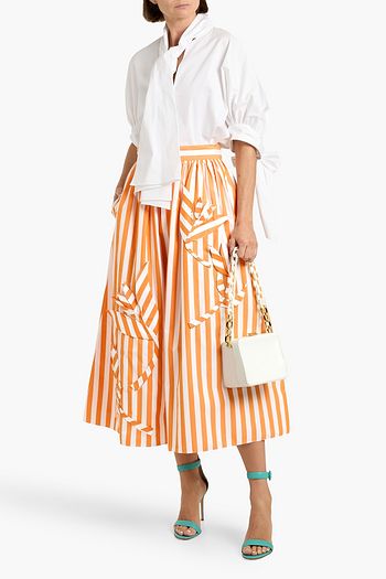 Striped floral-appliquéd cotton-poplin midi skirt