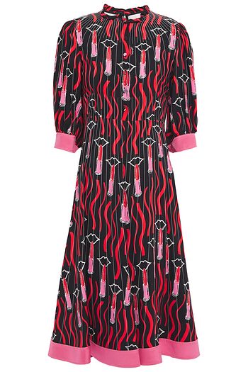 Lace-trimmed embroidered silk crepe de chine midi dress
