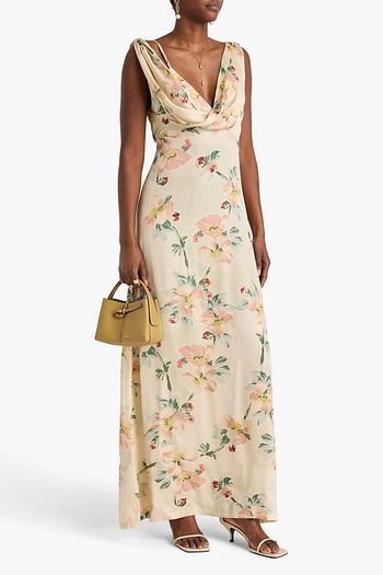 Asymmetric lace-trimmed floral-print linen and silk-blend maxi dress