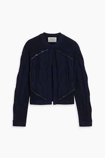 Chain-embellished cable-knit merino wool cardigan