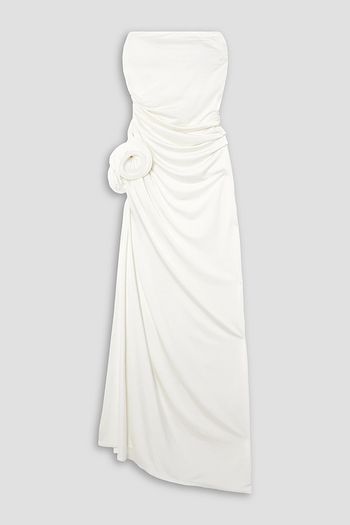 Strapless appliquéd ruched stretch-jersey gown