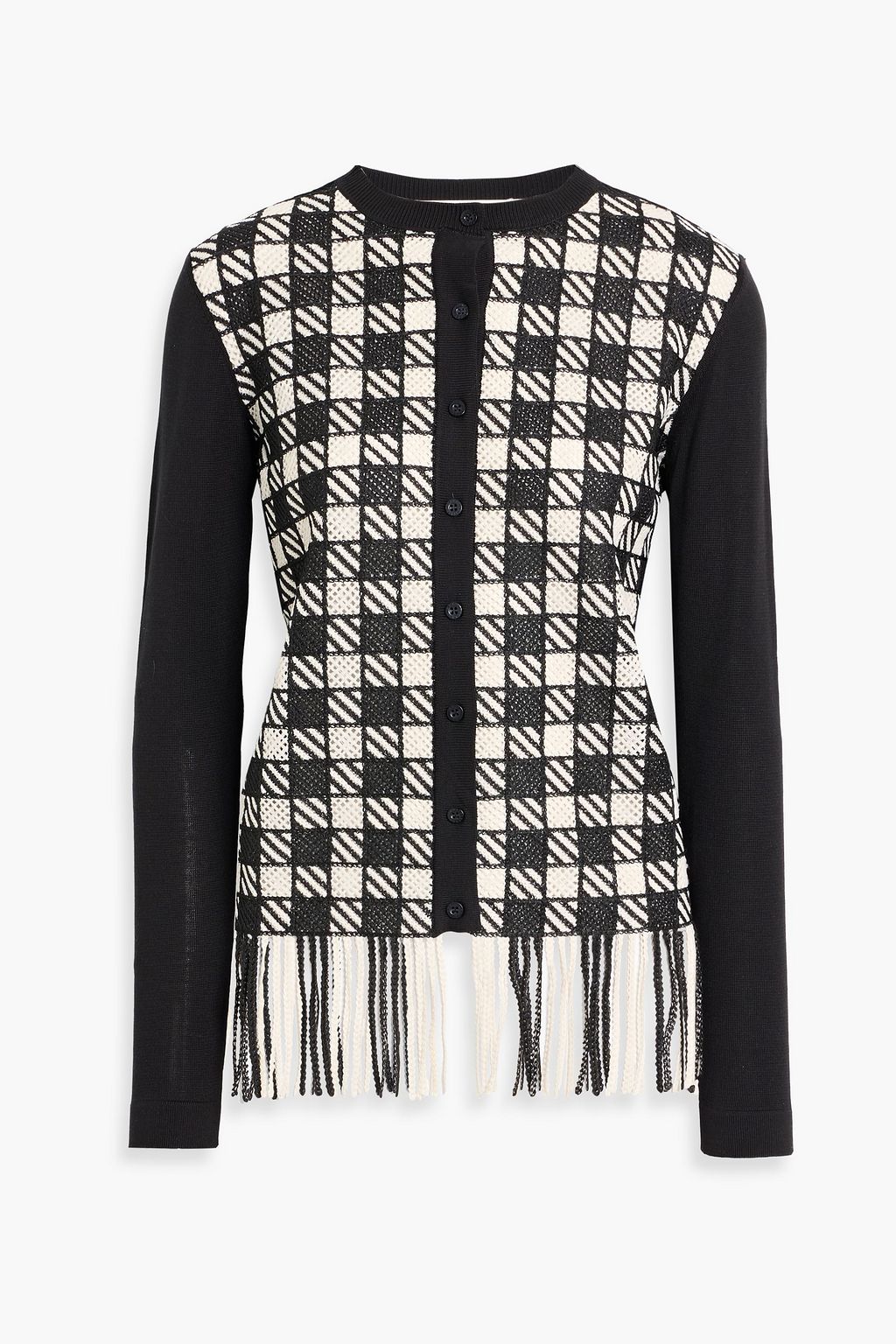 OSCAR DE LA RENTA Fringed checked jacquard knit-paneled silk-blend cardigan