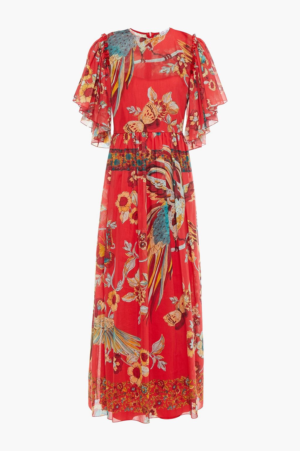 REDVALENTINO Gathered printed cotton and silk-blend voile midi dress