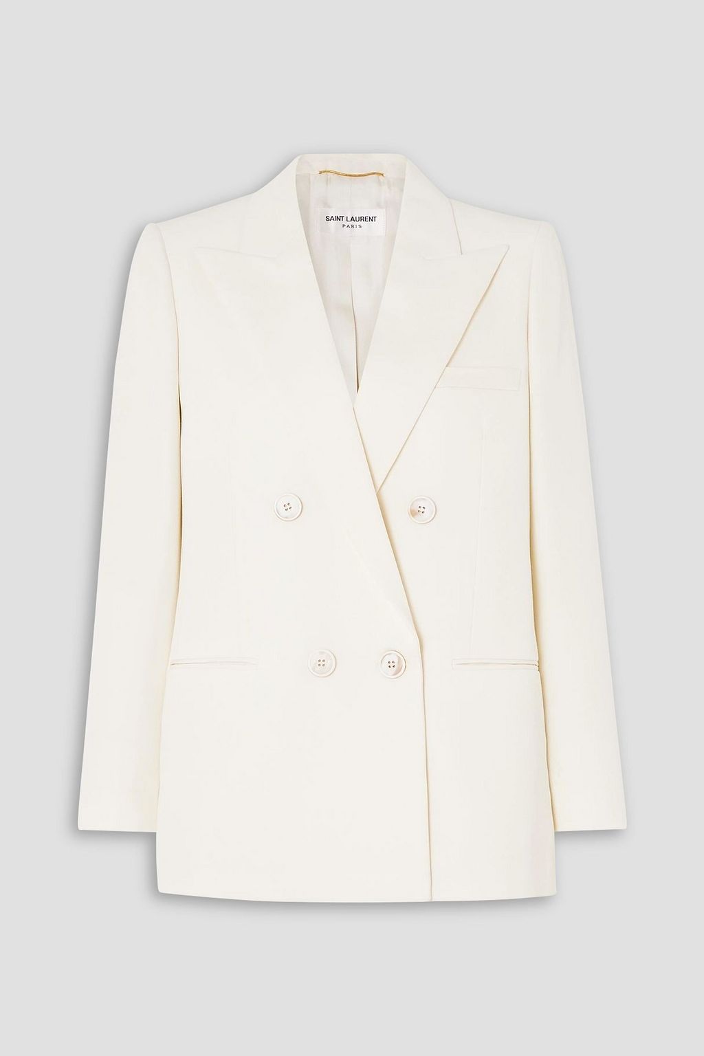 SAINT LAURENT's wool-twill blazer has been tailored with a double-breasted front, elegant notched lapels and tonal buttons. The sharply padded shoulders and slim sleeves add a beautifully feminine touch, while the timeless hue means you'll reach for it again and again.