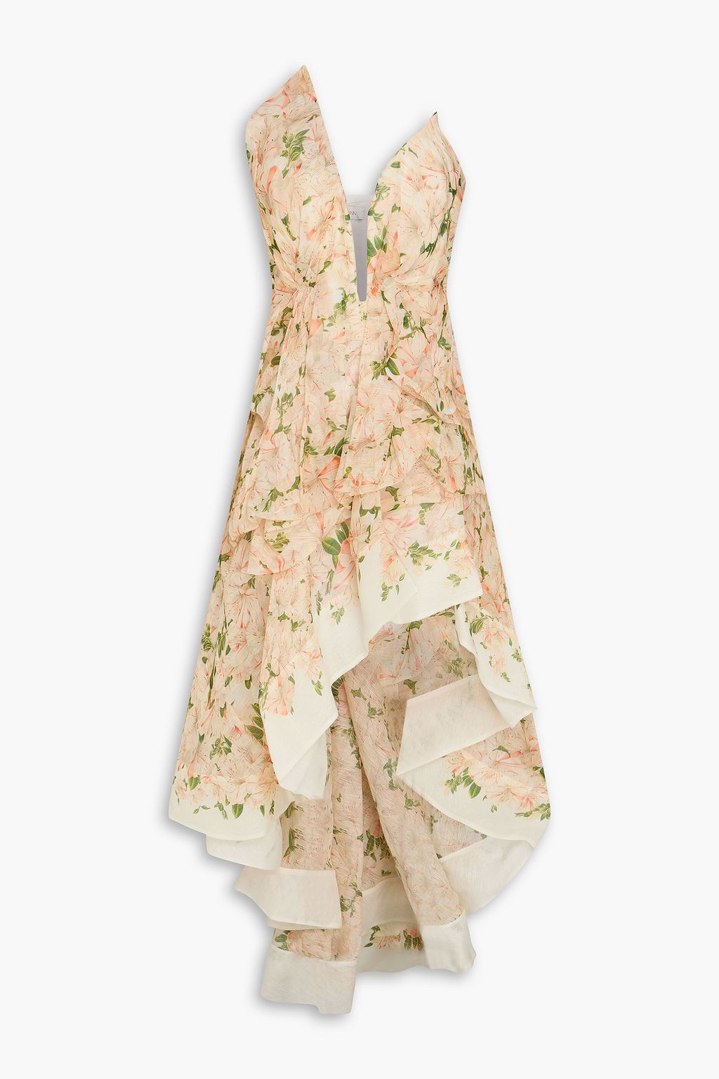ZIMMERMANN Strapless asymmetric floral-print linen and silk-blend maxi dress