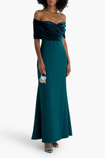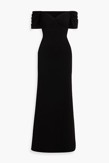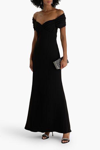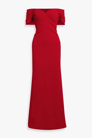 Off-the-shoulder ruffled plissé-georgette and crepe gown