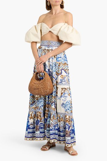 Crystal-embellished printed linen maxi skirt