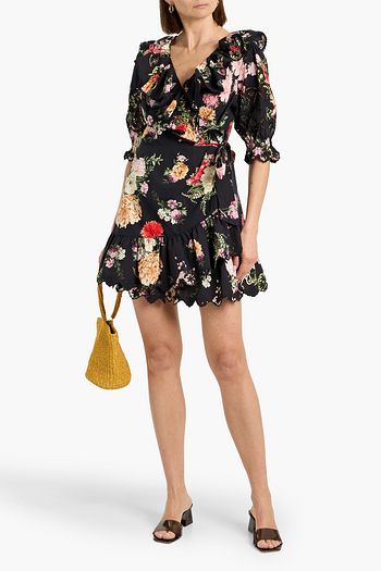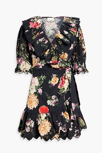 Cutout ruffled printed cotton-poplin mini dress