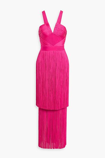 Crystal-embellished metallic ribbed bandage halterneck midi dress