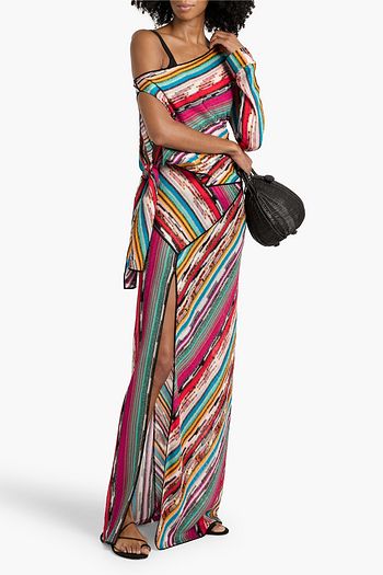 One-shoulder knotted metallic crochet-knit top