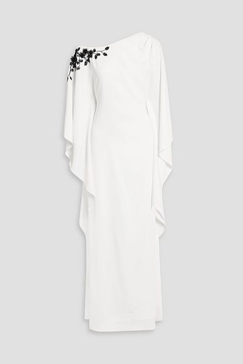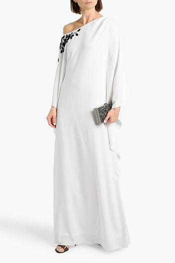 Atlanta asymmetric one-shoulder fringed crepe gown