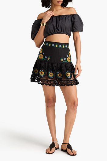 Embellished floral-appliquéd cotton and linen-blend mini skirt