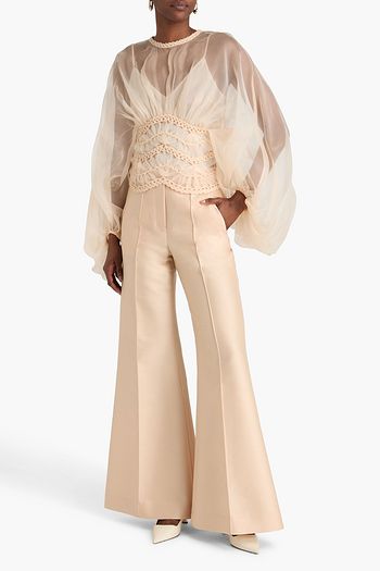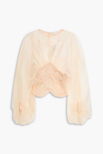 Point d'esprit-trimmed ruffled silk crepe de chine top