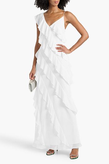 Off-the-shoulder ruffled plissé-georgette and crepe gown