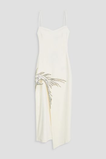 Asymmetric velvet-trimmed metallic cloqué-jacquard dress