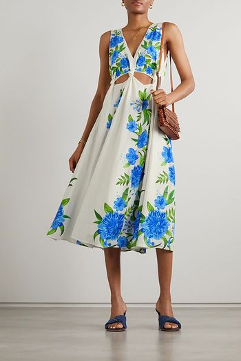 Belted ruffled printed crepe midi dress