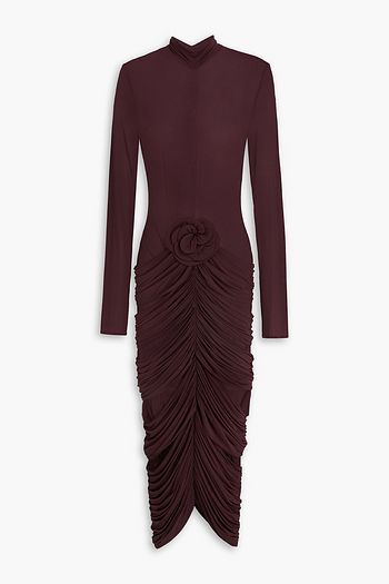 Ruched floral-appliquéd jersey halterneck maxi dress