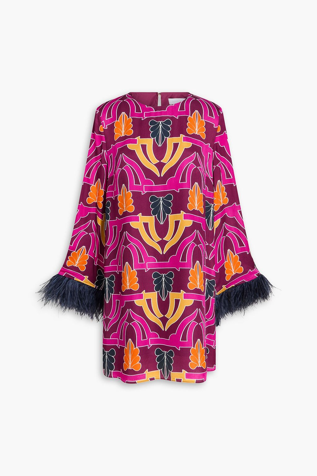 BORGO DE NOR Feather-trimmed printed satin-crepe mini dress