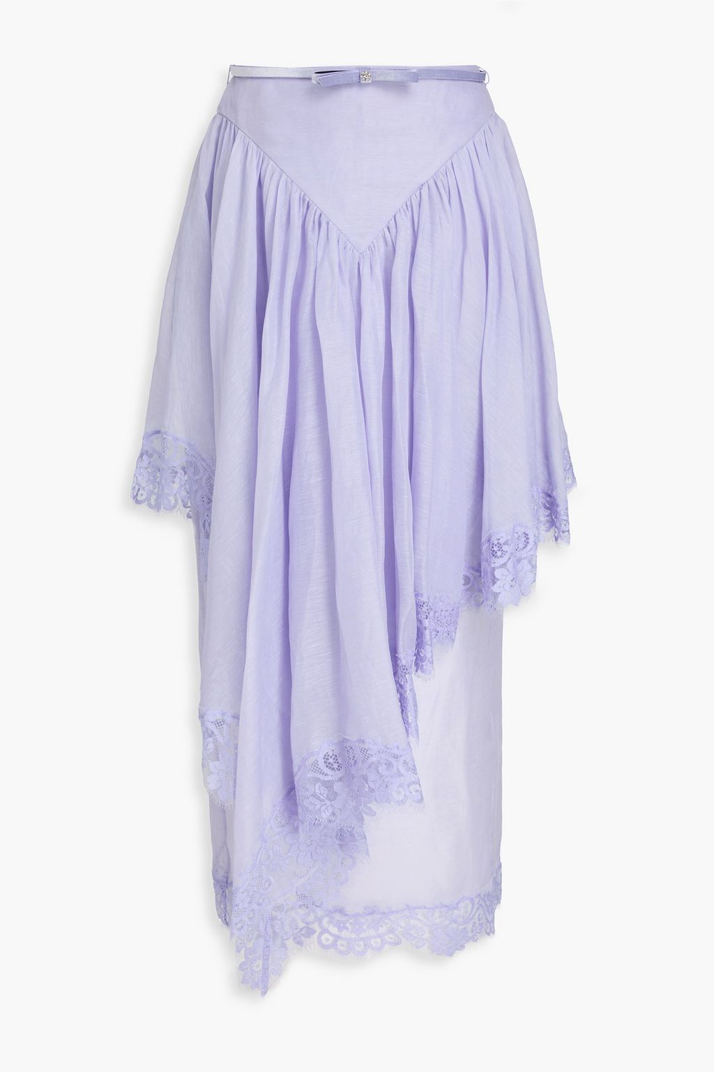 ZIMMERMANN Asymmetric lace-trimmed linen and silk-blend skirt