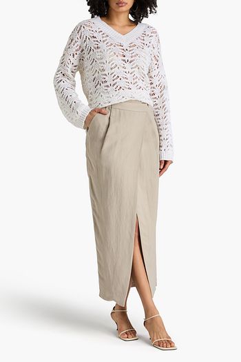Wrap-effect sequin-embellished linen-blend midi skirt