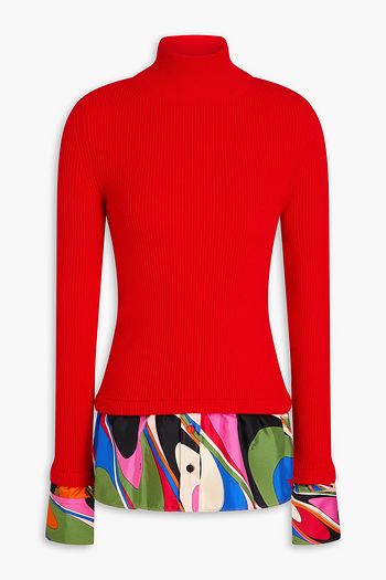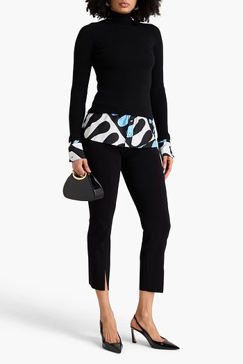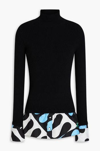Printed twill-paneled wool-blend turtleneck sweater