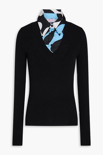 Printed twill-paneled wool-blend sweater