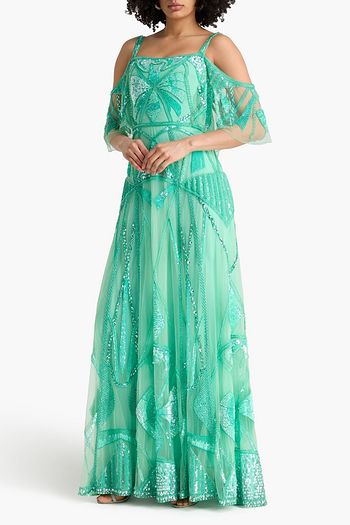 Off-the-shoulder embellished tulle midi dress