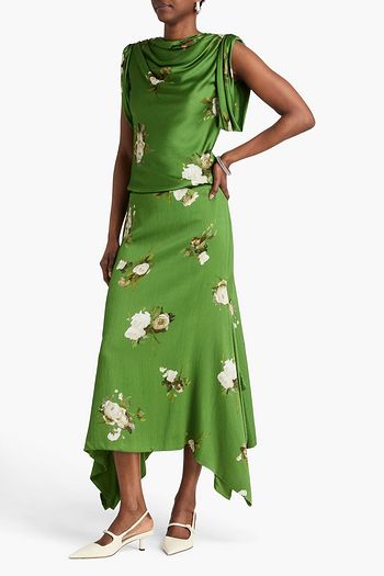 Draped floral-print twill midi skirt
