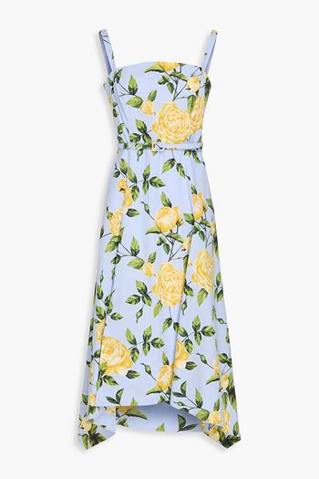 Asymmetric belted floral-print cotton midi dress