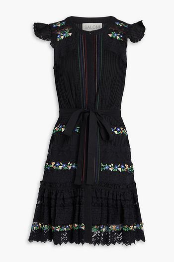 Embroidered tulle-trimmed wool-blend crepe mini dress