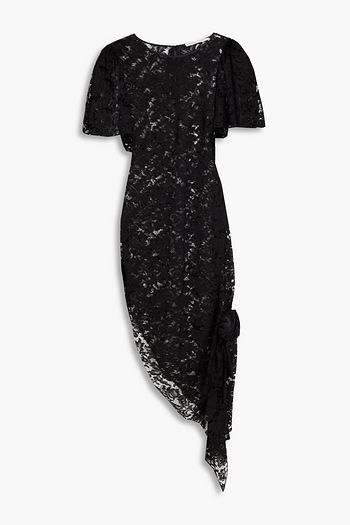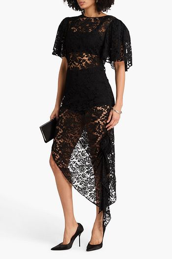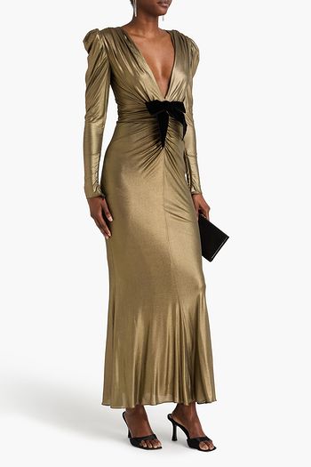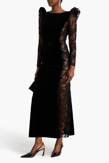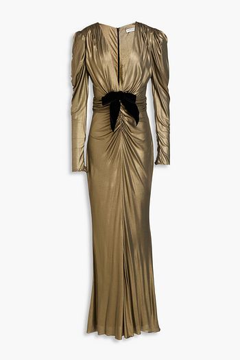 Pussy-bow ruffled silk-organza trimmed metallic lace mini dress