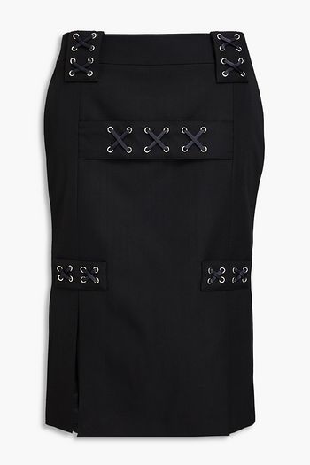 Cropped embellished metallic pinstriped wool-blend bustier top