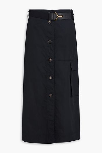 Leather-trimmed belted pleated cotton-twill midi skirt
