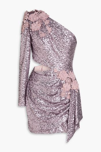 One-shoulder floral-appliquéd sequined silk-tulle mini dress