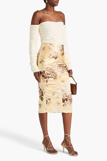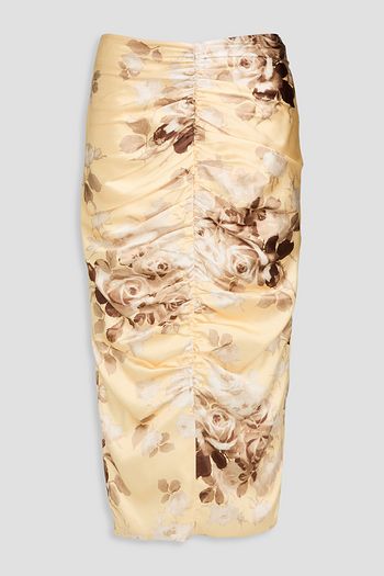 Ruched floral-print silk-blend satin midi pencil skirt