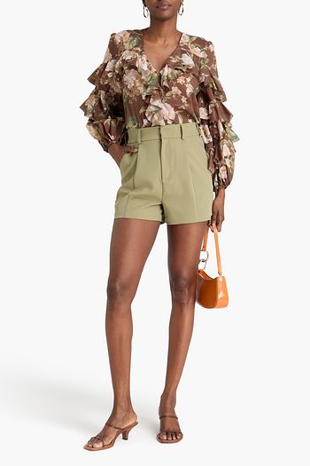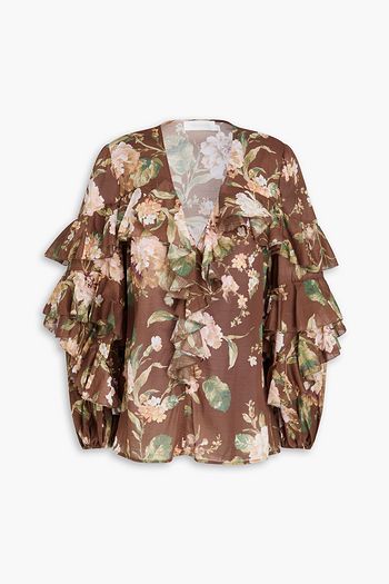 Embellished ruffled printed linen and silk-blend gauze mini dress