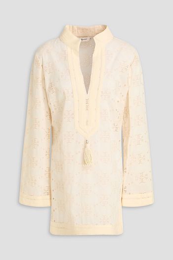Crocheted lace-trimmed ramie and cotton-blend gauze top