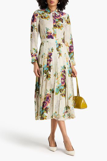 Pleated floral-print seersucker midi shirt dress