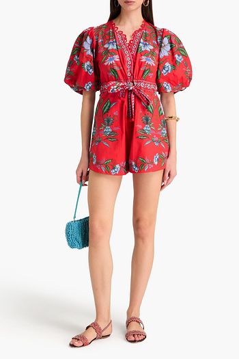 Belted embellished floral-print cotton playsuit
