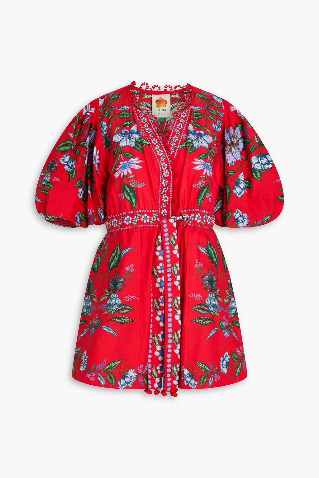 FARM RIO Guipure lace-trimmed floral-print cotton-poplin playsuit