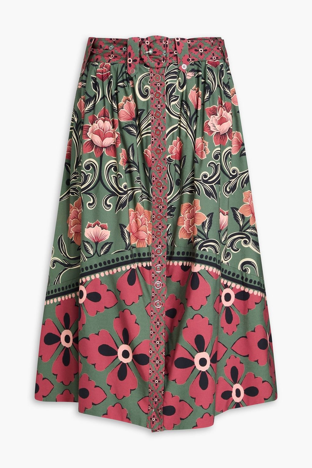 FARM RIO Belted floral-print cotton-poplin midi skirt