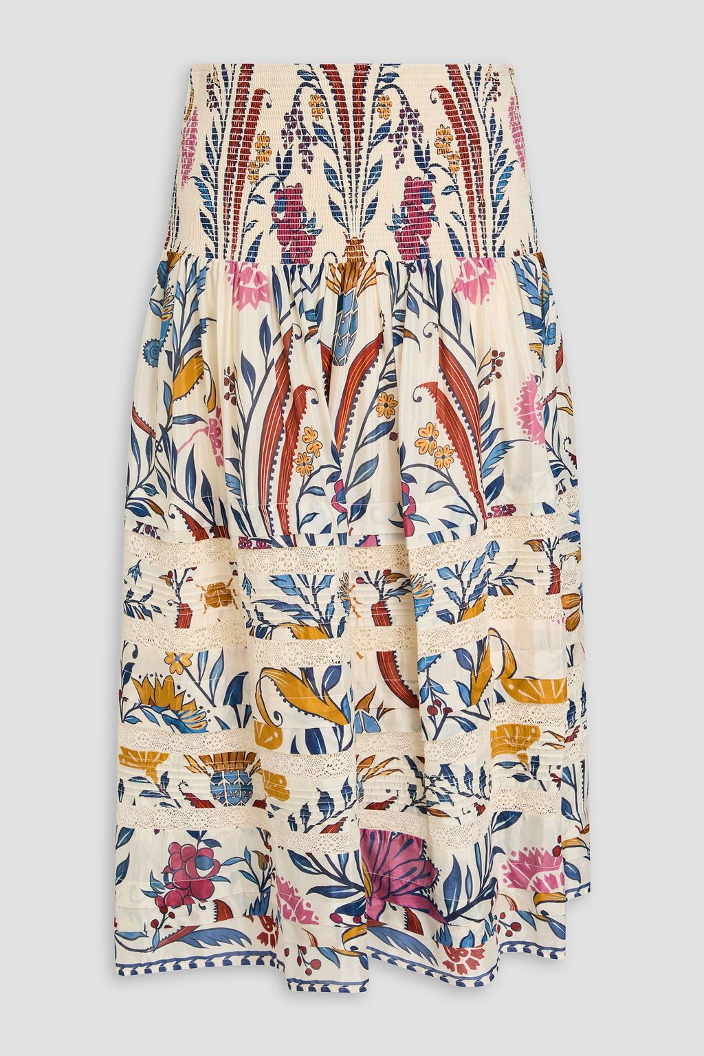 FARM RIO Crocheted lace-trimmed printed cotton-blend midi skirt